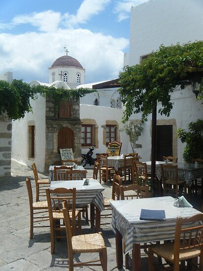 "Outdoor restaurant on Greek Island Patmos " by SlavicaB | Redbubble